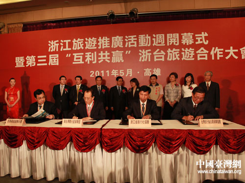 會上,浙江省旅游協(xié)會與臺灣觀光協(xié)會簽訂進(jìn)一步加強(qiáng)旅游交流、互送客源的合作意向書,浙江省旅游集團(tuán)與臺灣中華航空公司簽訂戰(zhàn)略合作框架協(xié)議,浙江省旅行社協(xié)會與臺灣旅行業(yè)品質(zhì)保障協(xié)會簽訂推進(jìn)兩地旅游品質(zhì)提升合作協(xié)議,活力浙東旅游聯(lián)合體與南臺灣高高屏觀光聯(lián)盟簽訂區(qū)域旅游合作協(xié)議。
