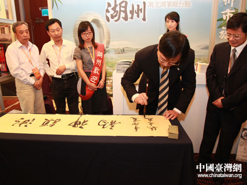 中共湖州市委書記孫文友在大會現(xiàn)場為本市旅游揮毫推薦。(浙江臺辦王健 攝)