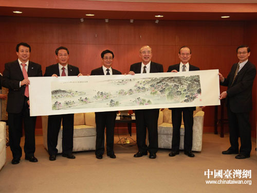 浙江省代表團向國民黨榮譽主席吳伯雄贈送畫卷“蘇堤春曉”。(浙江臺辦王健 攝)