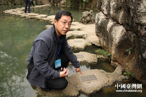 21日上午,到訪貴州的臺灣嘉賓先來到以石林景觀見長的天星橋景區,欣賞了“水上石林”,他們認真走過一年中的“每一天”,找尋刻有自己生日的那塊石頭。嘉賓們對于導游介紹的每個典故都認真觀看,到底美女是頭朝上還是頭朝下呢?這個藤是從哪伸出來的?認真思考的表情很是可愛。