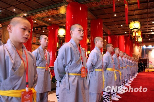 “中原文化寶島行”河南說明會十二月十六日在臺北圓山飯店舉行。圖為會前,來自河南嵩山少林寺的僧眾列隊歡迎與會嘉賓。 中新社發(fā) 曾嘉 攝