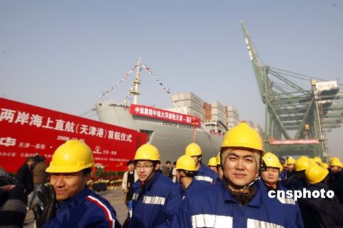 12月15日,海峽兩岸海上直航首航儀式在天津市天津港舉行。據悉,當日舉行首航儀式的,大陸有天津、上海、太倉、福州、廈門、泉州6個港口,臺灣有基隆、高雄2個港口,參加首航的船公司13家,其中大陸9家公司15艘船舶,臺灣4家公司5艘船舶。 中新社發 盛佳鵬 攝