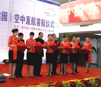 湖北省李鴻忠省長、田承忠副省長、武漢市阮成發市長、全國臺企聯何世忠常務副會長、中國東方航空集團公司陳海鞠副總裁為首航儀式剪彩 攝影:嚴越培
