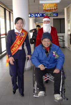 行動不便的范良明老人在機場服務人員的幫助下第一個進入直航班機 攝影:嚴越培