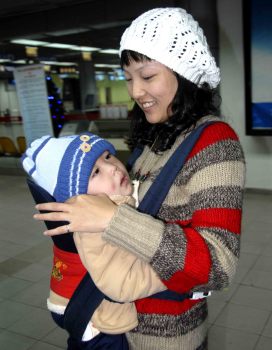遠嫁臺灣的武漢人費莎女士帶著8個月大的兒子乘直飛航班返漢 攝影:嚴越培