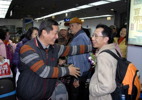 臺商、武漢海派旅游公司總經理包東輝在機場迎接專程來湖北武漢的臺灣百家采線團 攝影:嚴越培