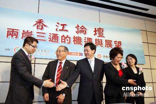 由香江文化交流基金會主辦的“香江論壇---兩岸三通的機遇與展望”,六月二日在香港會展中心舉行。圖為香港政制及內地事務局長林瑞麟(中)與主持人香江文化交流基金會主席江素惠(右二)歡迎與會者。中新社發 洪少葵 攝