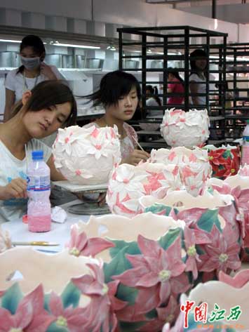 在法藍瓷景德鎮生產基地,技術工人正在熟練地進行繪色工序。(江西網 王建亮 攝)