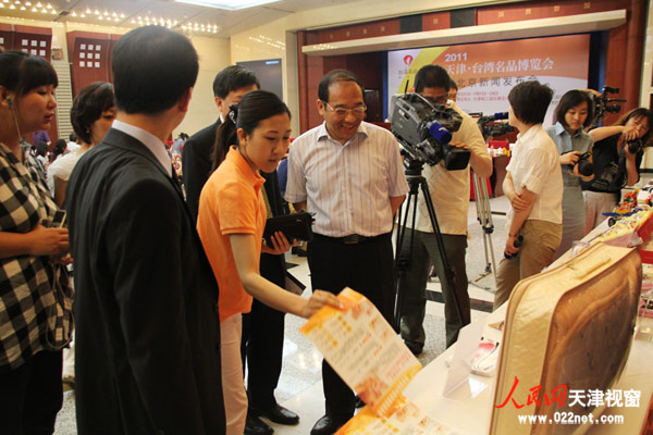 人民網·天津視窗6月14日電:6月13日下午,“2011天津-臺灣名品博覽會”在中國貿促總會大禮堂召開首次新聞發布會。從發布會上獲悉,7月7日至10日“2011天津-臺灣名品博覽會”將在天津梅江會展中心舉行。會上,天津市人民政府副秘書長李培生臺北世界貿易中心副總經理黃文榮分別代表主辦單位介紹展會特色及最新展覽訊息。此外,現場還提前展示了多項亮點產品。