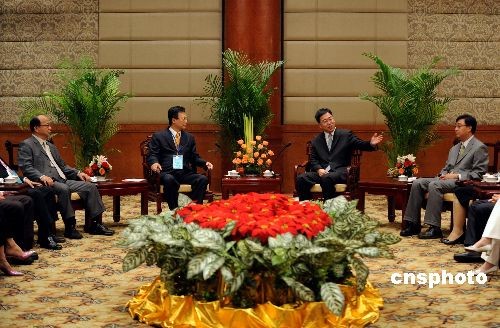 6月26日,國(guó)家旅游局副局長(zhǎng)杜江在北京國(guó)際飯店會(huì)見(jiàn)臺(tái)灣中部四縣市負(fù)責(zé)人,臺(tái)中市市長(zhǎng)胡志強(qiáng)、彰化縣縣長(zhǎng)卓伯源、臺(tái)中縣縣長(zhǎng)黃仲生、南投縣農(nóng)業(yè)處處長(zhǎng)陳朝旺。 中新社發(fā) 廖攀 攝