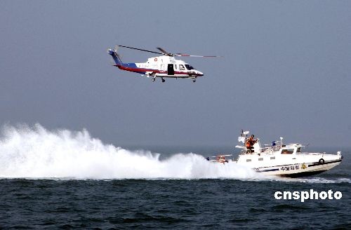 2008年10月23日下午,廈金航線海上搜救演習(xí)在廈門灣水域舉行,海峽兩岸共出動(dòng)25艘船舶、16艘輔助船舶以及兩艘直升機(jī)參與演習(xí)。演習(xí)的目的是為了檢驗(yàn)兩岸直航航線搜救應(yīng)急預(yù)案的科學(xué)性和可操作性,檢閱實(shí)際搜救指揮協(xié)調(diào)能力和搜救成效,以更好地保障廈金航線海上運(yùn)輸和海上作業(yè)安全。圖為直升機(jī)配合海事救助船只進(jìn)行演練。 中新社發(fā) 王東明 攝