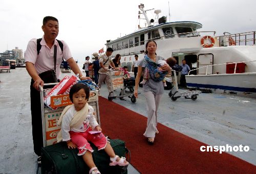 2007年九月二十四日,離傳統(tǒng)中秋佳節(jié)僅剩一天時(shí)間,廈(門)金(門)航線比平時(shí)顯的更加忙碌,臺(tái)商紛紛往返廈金兩地過中秋。 中新社發(fā) 王東明 攝
