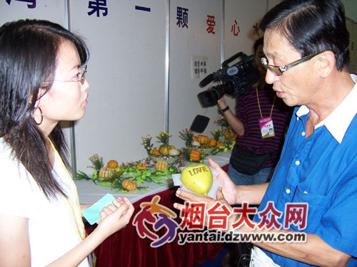 在臺灣中農集團展臺前,兩個“愛心”柚子吸引了參觀者,記者看到,這兩個柚子有巴掌大小,金黃色,上面還分別有雙喜和英文“LOVE”等文字。集團負責人簡楊柳先生告訴記者,這樣的柚子目前售價50元一個,而柚子呈現特殊的形狀得益于一種特殊的模子,從柚子很小時就套上這種模子,直到長大就可以得到想要的形狀了;由于這種種植方式是剛剛研究成功的,而這兩個柚子更是一星期前摘下,專為參加果蔬會從臺灣空運來的,所以此次亮相果蔬會還是“愛心”柚子首次與大家見面呢。