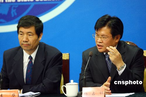 五月三十一日,國(guó)務(wù)院臺(tái)灣事務(wù)辦公室在北京國(guó)臺(tái)辦新聞發(fā)布廳舉行例行新聞發(fā)布會(huì),作為大陸地區(qū)最大的農(nóng)民合作經(jīng)濟(jì)組織,供銷總社辦公廳副主任楊占科(右)在談及“適時(shí)組織由有實(shí)力的農(nóng)產(chǎn)品供銷企業(yè)和行業(yè)組織組成的臺(tái)灣農(nóng)產(chǎn)品采購(gòu)團(tuán),赴臺(tái)采購(gòu)”的問題時(shí)指出:組織采購(gòu)團(tuán)的工作已全面展開,并與臺(tái)灣方面進(jìn)行了初步溝通、協(xié)商,力爭(zhēng)早日成行,以達(dá)到幫助臺(tái)灣農(nóng)民解決農(nóng)產(chǎn)品豐產(chǎn)滯銷的問題,同時(shí)也為大陸消費(fèi)者提供來自臺(tái)灣的新品種、高質(zhì)量的農(nóng)副產(chǎn)品,實(shí)現(xiàn)互利雙贏之目的。中新社發(fā) 盛佳鵬攝