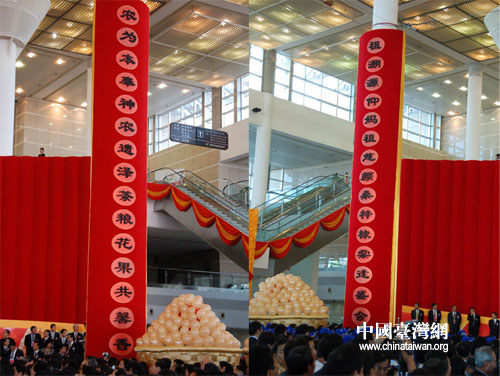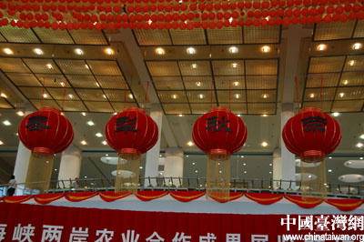 海峽兩岸農業合作成果展覽暨項目推介會今天(19日)上午在廈門開幕。整個會場融入中國的傳統元素,包括中國傳統的對聯、燈籠,此外結合本次兩岸農業合作論壇的主題,凸現農業特色(云鵬/攝影)