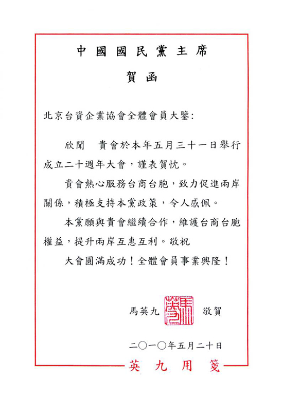 中國國民黨主席馬英九的賀信