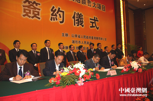 中國臺灣網(wǎng)9月27日濰坊消息 “第十四屆魯臺經(jīng)貿(mào)洽談會(huì)大項(xiàng)目簽約儀式”于昨天下午在濰坊舉行。山東省有關(guān)部門、濰坊市政府負(fù)責(zé)人及簽約項(xiàng)目雙方代表參加儀式。