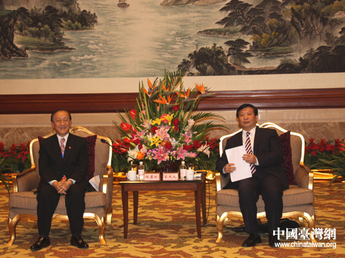 山東省委副書記、省長姜大明與臺灣新黨主席郁慕明座談。(攝影:董潔)