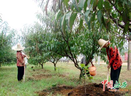 樂安農民正在按照臺灣的技術給果樹施肥。(來源:中國江西新聞網 攝影:王凱)