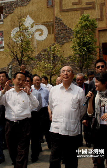 今日上午,國民黨榮譽(yù)主席吳伯雄率領(lǐng)前來參加兩岸經(jīng)貿(mào)文化論壇的百余臺灣嘉賓前往汶川映秀鎮(zhèn)、水磨鎮(zhèn)考察災(zāi)后重建情況。圖為吳伯雄參訪水磨鎮(zhèn)并聽取相關(guān)人員介紹災(zāi)后重建情況。(中國臺灣網(wǎng) 高斯斯 攝)