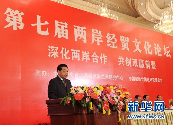 5月8日,第七屆兩岸經(jīng)貿(mào)文化論壇在四川成都閉幕。中共中央政治局常委、全國政協(xié)主席賈慶林和中國國民黨榮譽(yù)主席吳伯雄出席閉幕會。這是中共中央政治局常委、全國政協(xié)主席賈慶林致辭。 新華社記者 饒愛民 攝