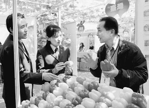 四月二十日,博覽會上,中國臺灣鮮美農產有限公司董事長蔡易新(右一)向參觀者介紹產自臺灣的五彩椒。 新華社記者 陳樹根 攝 | |