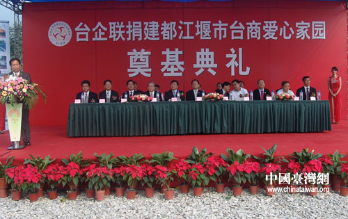 今年5月12日四川汶川發生強烈地震后,臺企聯積極組織會員向災區捐款捐物,表達愛心;同時認真研究如何支援災區的重建工作。臺企聯會員結合臺灣“9·21”地震累積的經驗,規劃在四川修建抗震度較高的災民安置社區。經過會長公益會議的討論,臺企聯決定在四川都江堰市捐贈一所臺商“愛心家園”社區,此提議得到了廣大臺商及會員企業的積極響應。在國臺辦、四川省臺辦、成都市臺辦、都江堰市政府的支持下,今日“愛心家園”舉行奠基儀式,揭開了工程啟動開工的序幕,