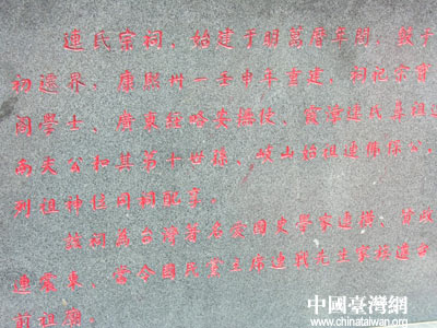 他回顧到,小時候,看到阿公(爺爺)寫的連家歷史,那時候雖不太清楚,但知道了連家是從漳州馬崎社遷到臺灣的。逐漸長大后,也知道了連家是連興位公于1682年,清初的時候到臺灣臺南的。連戰(zhàn)接著以普通話強調(diào),這里的土地是祖先辛苦耕耘過的土地,此時我非常的感動,請允許我以去年西安小朋友的話來表達我的心情。連戰(zhàn)隨后激動而富有激情的大聲說道:連家的列祖列宗、爺爺,我回來了!我終于回來了!