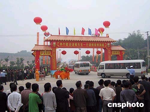 中新網4月19日電 中國國民黨榮譽主席連戰與家人等,今日(19日)上午9時20分左右在福建漳州龍海馬崎村祭祖。馬崎村民熱情地歡迎了連戰一行。