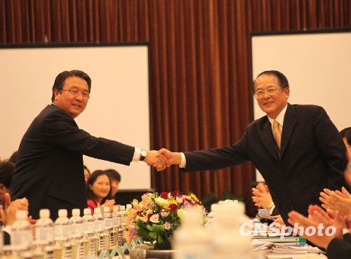 兩岸經(jīng)濟(jì)框架協(xié)議(ECFA)第二次協(xié)商3月31日在臺(tái)灣桃園縣鴻禧大溪?jiǎng)e館舉行。圖為會(huì)談開(kāi)始時(shí)大陸方面主談代表商務(wù)部臺(tái)港澳司司長(zhǎng)唐煒與臺(tái)灣主談代表黃志鵬(右)握手。 中新社發(fā) 耿軍 攝
