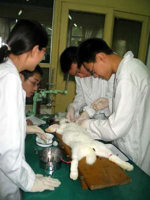 暨南大學國際學院臨床醫學專業的臺灣學生(右一)正在上實驗課
