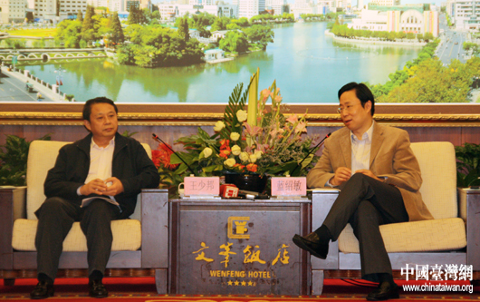 11月6日下午,南通市委常委、常務副市長藍紹敏(右)會見了前來采訪的兩岸媒體“江蘇沿海行”記者。(中國臺灣網 王偉 攝)