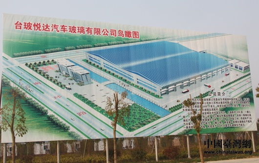在臺玻悅達參觀時,項目正在緊張建設之中。記者從路旁的鳥瞰圖了解到,臺玻悅達汽車玻璃有限公司是由臺灣玻璃工業集團與鹽城市經濟開發區、江蘇悅達集團正式簽約,共同投資興建汽車玻璃項目,該項目注冊資金3000萬美元,總投資9000萬美元,占地200畝,一期工程預計在2011年12月竣工投產。另據了解,截至今年9月,鹽城共有臺企622家,臺資僅次于韓資,已經成為該市第二大外資來源。