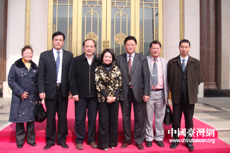 安徽省臺辦主任朱德祥(左三)、合肥市臺辦主任徐延安(右三)與國際青商會臺灣總會前總會長王玲嬌(中)合影留念。