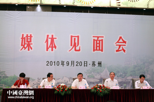 9月20日,蘇州市委副書記、市長閻立(中)等同采訪“江蘇臺灣周”的各路媒體記者見面,介紹了蘇州與臺灣經貿合作交流情況。(中國臺灣網 鐘寶華 攝)