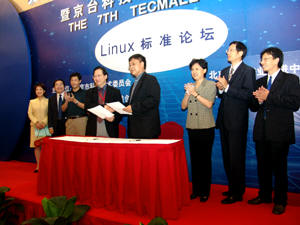 9月11日訊:共創(chuàng)軟件聯(lián)盟與臺(tái)北電腦公會(huì)Linux促進(jìn)會(huì)在第七屆京臺(tái)科技論壇期間,于2004年9月10日,在雙方舉辦的交流洽談會(huì)上達(dá)成:進(jìn)一步推動(dòng)京臺(tái)技術(shù)領(lǐng)域交流與合作,建立長(zhǎng)效合作機(jī)制的如下合作意向: