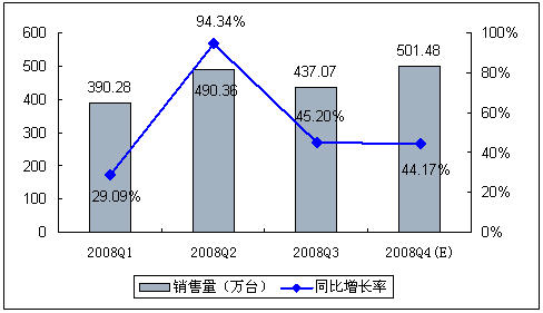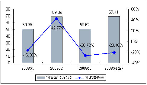 移動硬盤市場表現不盡人意。除2008年第二季度受奧運效應的正面刺激外,其余三季度移動硬盤市場的同比增長速度均表現為負值。面對消費者需求的下滑、市場淡季行業采購的減少、閃存盤容量擴充導致的替代功能、組裝貼牌產品的低價營銷,共同導致移動硬盤品牌廠商的增幅受限。預計2008年第四季度,移動硬盤市場銷量將達到70萬片左右。