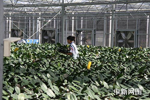 漳州富圣蘭花生物科技有限公司內一名員工在園區(qū)內修正蘭花