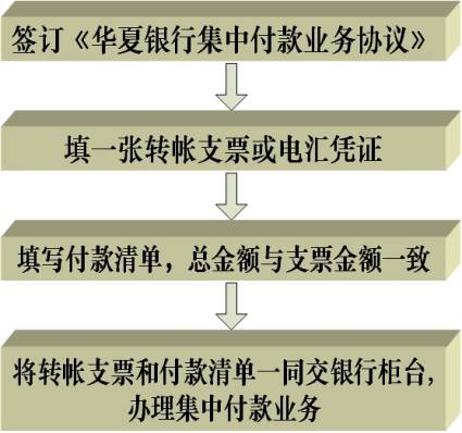 集中付款業務是指付款人在需要向多個收款人支付貨款時,依據與我行簽訂的《華夏銀行集中付款業務合作協議》,向我行提交一張支票(或電匯憑證)和與匯款內容對應的支付清單,同時完成向多個收款人支付款項的結算業務。付款人也可以使用"華夏互連通"集中付款軟件錄入支付信息,通過華夏銀行網上企業銀行一次性向多家收款人進行支付。