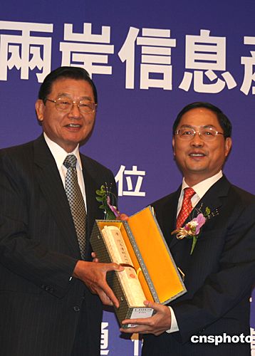 圖為華聚產業共同標準推動基金會董事長江丙坤(左),中國通信標準化協會名譽理事長、信息產業部副部長蔣耀平互贈禮品。