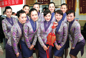 17日,廈航公布2006年春節包機空姐服裝和配餐。空姐身著新裝亮相。陳理杰攝(圖片來源:新京報)