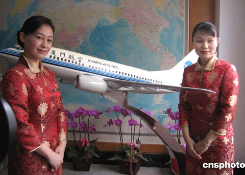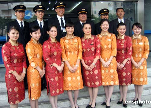 資料圖片:廈航臺商春節包機上的空姐,大都來自廈門等閩南地區,將身著改良的唐裝提供閩南話服務。圖為2005年1月27日包機空姐身著新裝亮相。中國新聞網作者:楊伏山