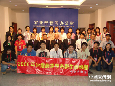 中國臺灣網6月28日消息 昨天下午,臺灣青年學生大陸訪問團一行33人應邀來農業部參觀訪問。參觀訪問團成員都是在島內大學學習獸醫、畜牧和農經等專業的學生,大陸海峽兩岸農業交流協會特別邀請農業部相關司局的負責人、青年干部與臺灣學生進行了交流,進一步增進臺灣學生對大陸農業農村發展的認識、了解,從而推動兩岸農業交流與合作的長遠發展。