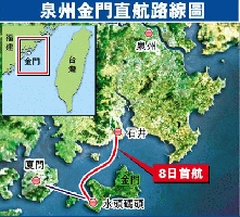 人民網(wǎng)6月7日電 據(jù)香港《文匯報》報道,繼大陸與臺灣“兩門兩馬”(金門-廈門,馬祖-馬尾)海上航線于2001年開通,拉開金廈“小三通”序幕之后,6月8日,備受兩岸關注的福建泉州石井與金門之間的客運直航也將開啟,成為閩南沿海距金門最近的海上“黃金水道”。經(jīng)常往返于兩地的臺胞和兩岸的旅游業(yè)者,對這一新航線都充滿了期待。