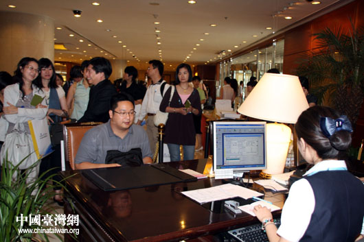 中國臺灣網7月6日北京消息 以“兩岸攜手,合作共贏”為主題的2009兩岸互聯(lián)網發(fā)展論壇將于7日在北京開幕。記者今天在位于北京新世紀日航酒店大堂的論壇簽到處,發(fā)現了幾個非常熟悉的面孔:臺灣中時電子報總編輯陳彥豪、臺灣工商時報社長兼總編輯王嶠奇、網絡家庭國際信息(PCHOME ONLINE)董事長詹宏志、安吉斯集團大中華區(qū)執(zhí)行長李桂芬……這些臺灣主流媒體當家人和業(yè)界領軍人物可能是頭一次聚得這么齊,簽到之余,還忙著互相打招呼換名片。
