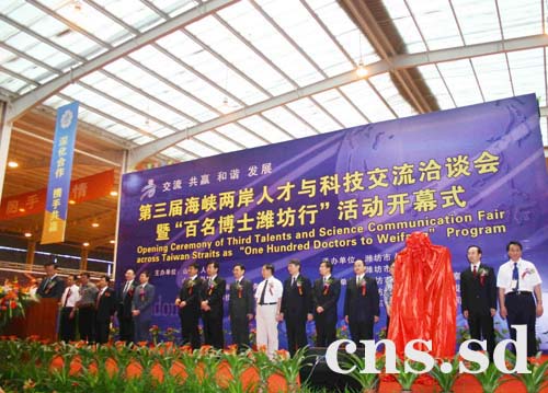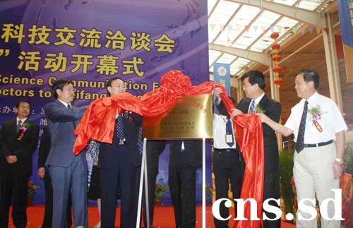 開幕式上,應邀出席的中國國家人事部留學人員和專家服務中心主任莊子健、國家人事部專業技術人員管理司巡視員謝軍、山東省人事廳副廳長鄭忠德及濰坊市委副書記、市長許立全為“中國博士后科技成果開發轉化基地濰坊基地”揭了牌。