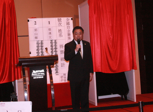 三位會(huì)長(zhǎng)候選人張漢文、郭山輝、林伯豐分別進(jìn)行了10分鐘的政見發(fā)表,向與會(huì)會(huì)員闡述執(zhí)政理念及當(dāng)選后的執(zhí)政規(guī)劃。經(jīng)過(guò)兩輪的不記名投票,郭山輝、張漢文分別獲得選票101張和100張。