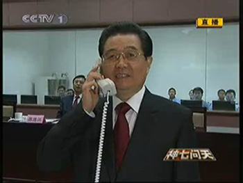 9月27日,中共中央總書記、國家主席、中央軍委主席胡錦濤與順利完成太空行走的航天員進行天地對話。以上為中央電視臺現場直播回放。
