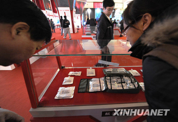11月11日,觀眾在參觀神舟七號飛船上的航天食品。 新華社記者徐亮攝