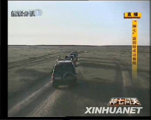 9月28日,神七返回艙成功著陸。這是搜救車隊正趕往著陸場。新華社發(電視截圖)